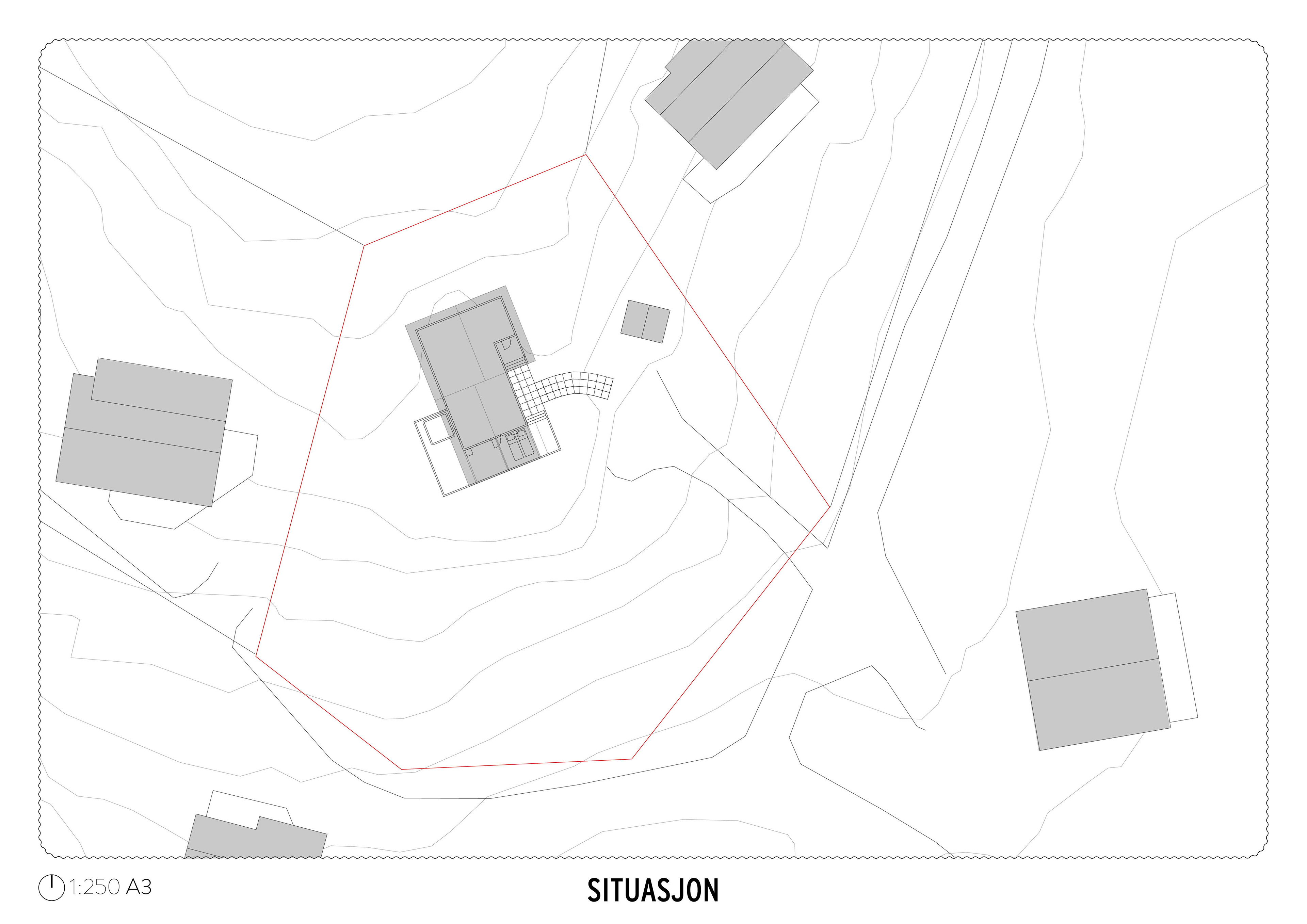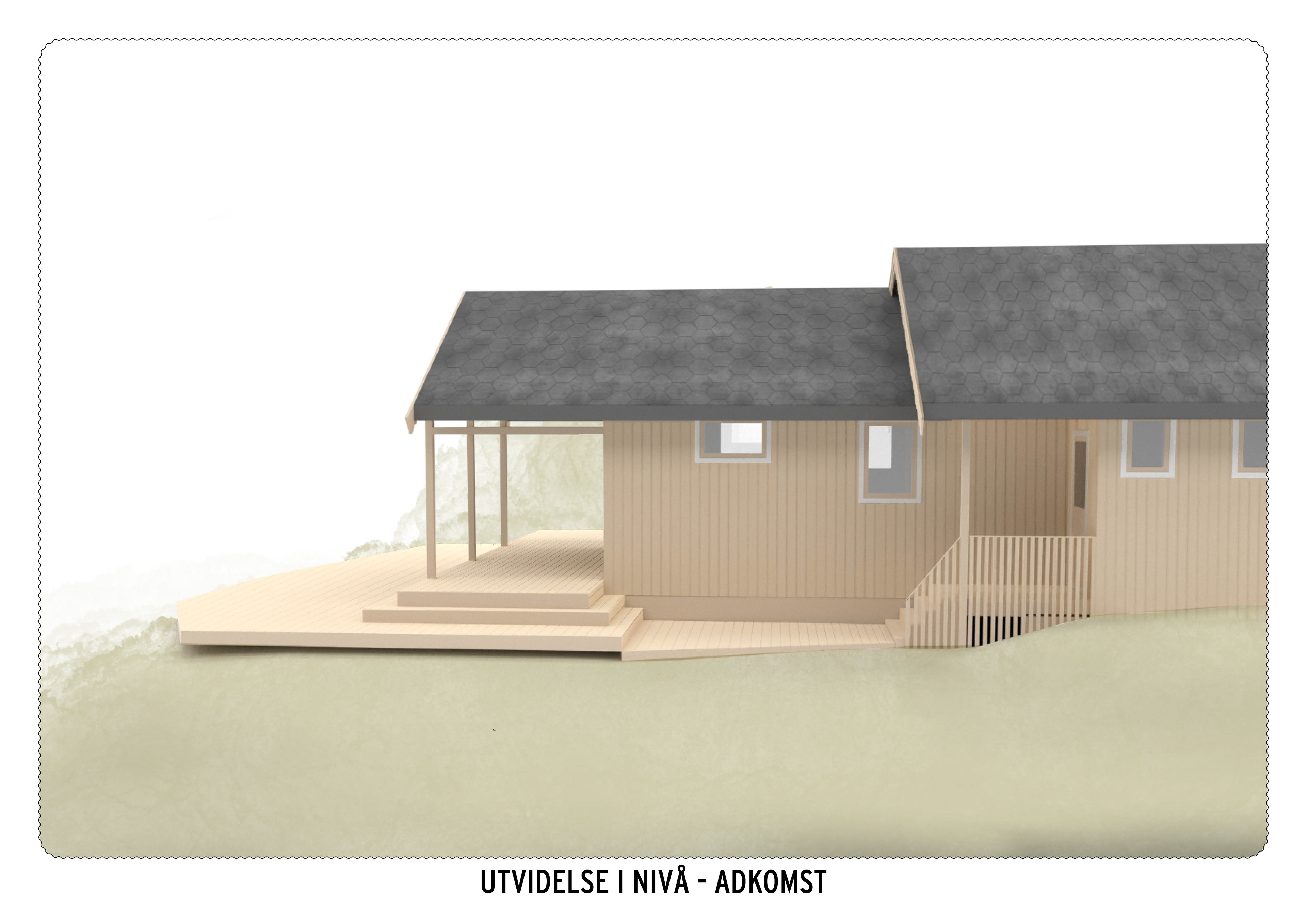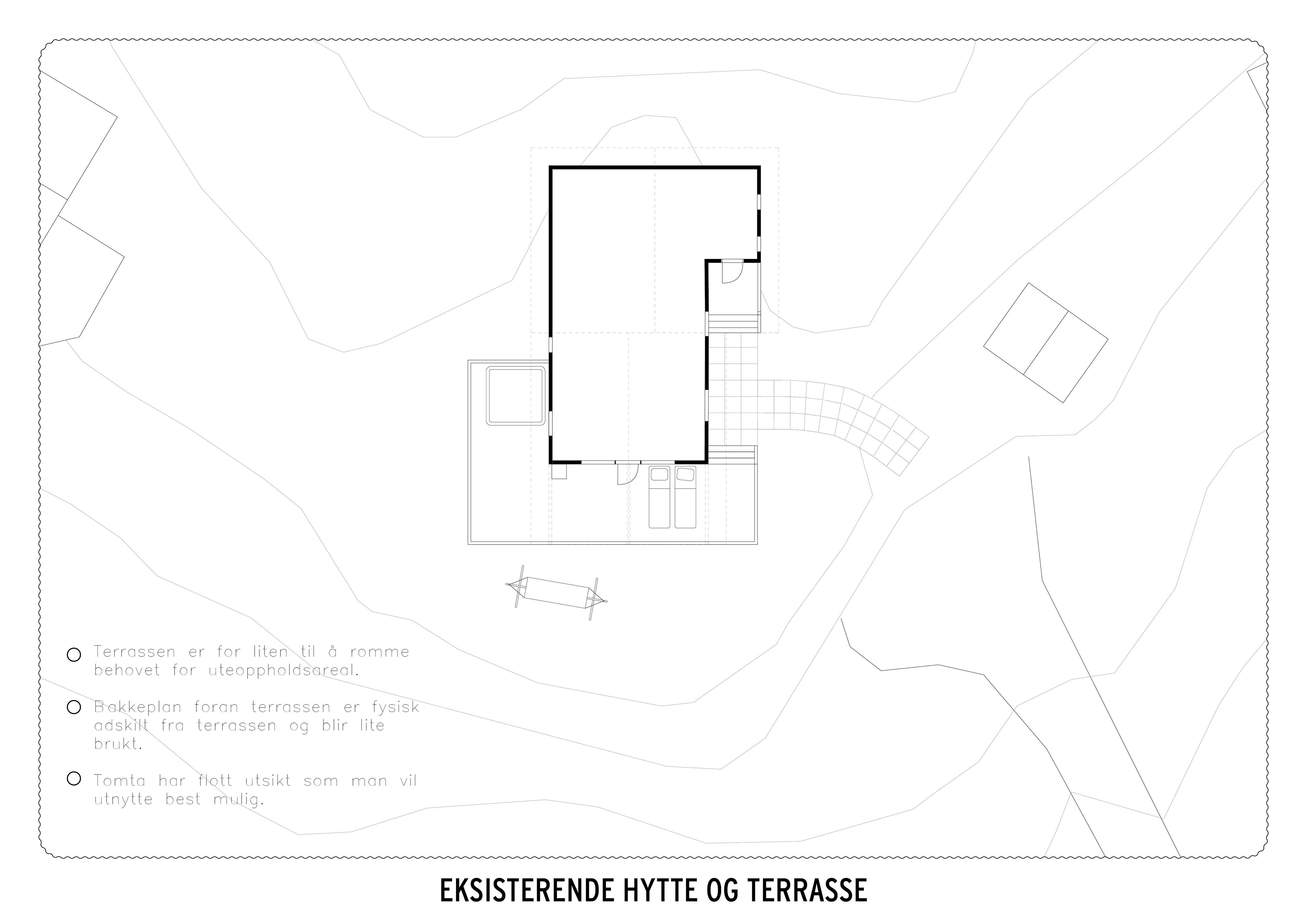 Hytta har fine uteområder med spennende vegetasjon, men bratt terreng. Eksisterende terrasse var nesten en meter over bakkenivå og hadde rekkverk som gjorde terrassen adskilt fra uteområdene foran og dessuten hindret en del av utsikten.