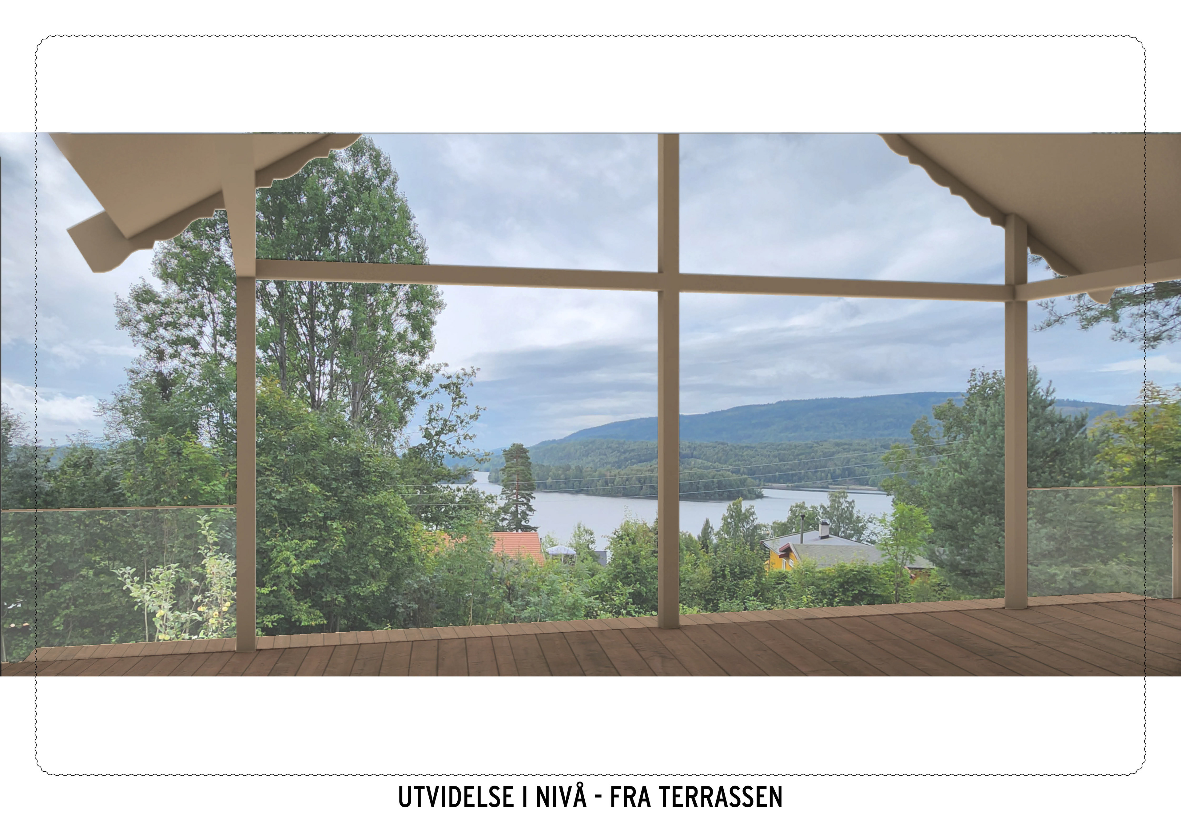Forslag til utvidelse av terrasse og uteområder i tilknytning til en hytte i Eidsfoss med flott utsikt over vannet.