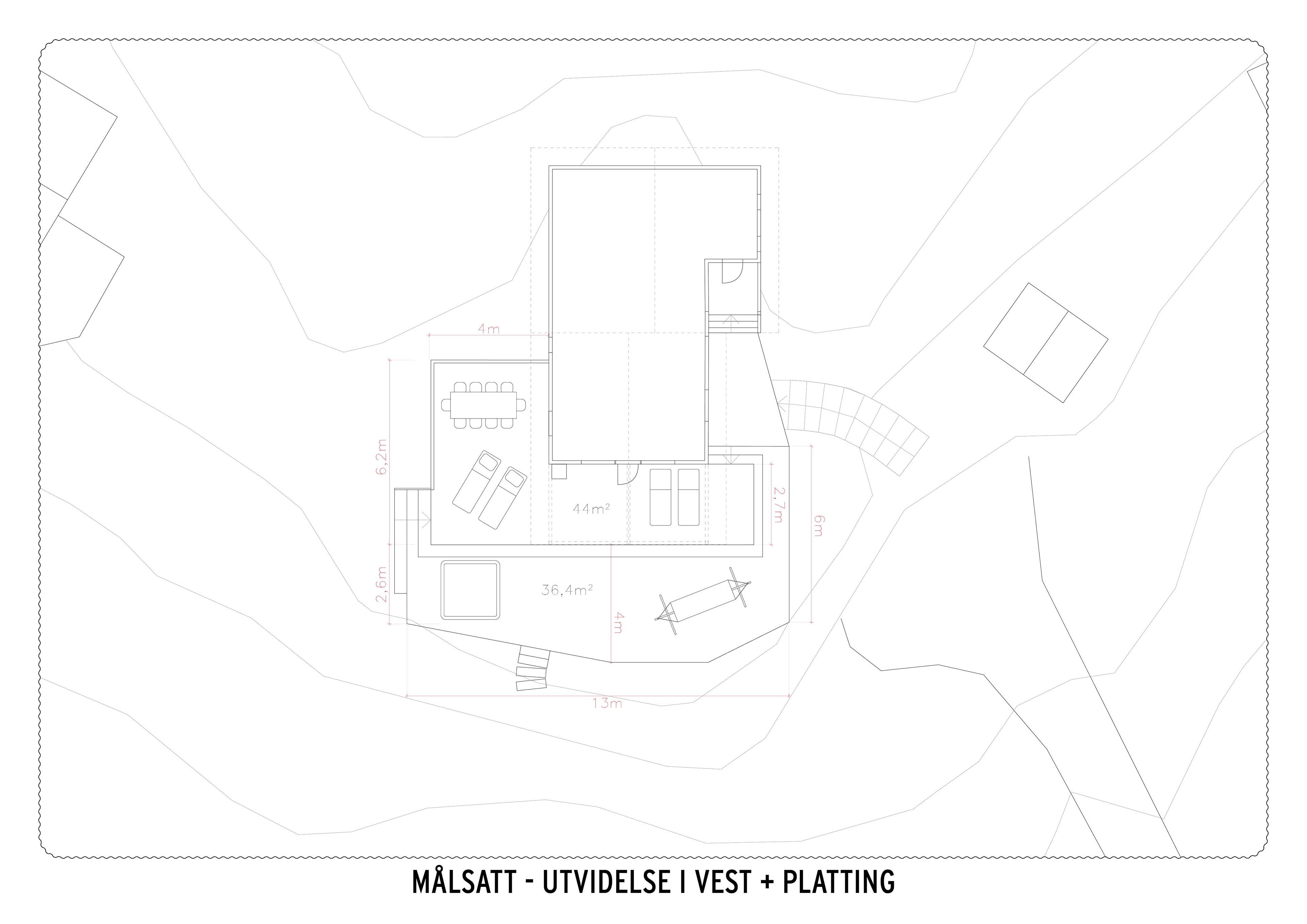 Forslaget innebærer en utvidelse av terrassen vestover, og nedtrapping mot platting.