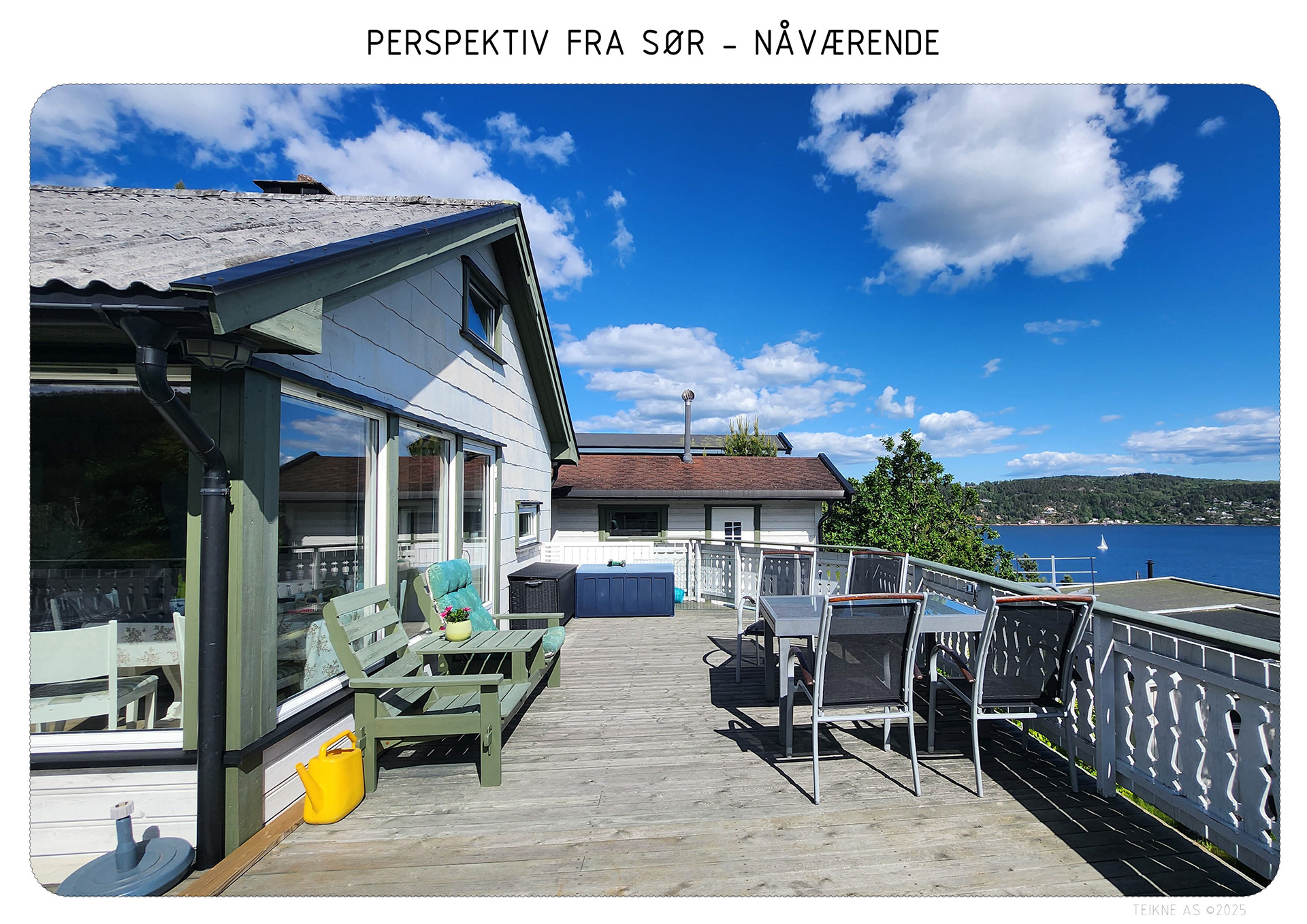 Forslag til utvidelse av en hytte på Berger. Utvidelse av terrasse, samt tilbygg med to soverom.